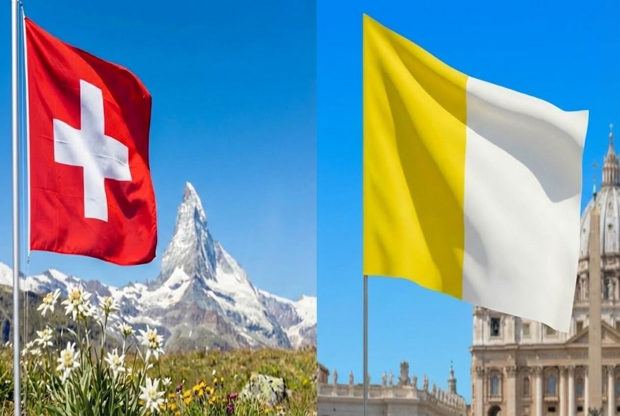 Флаг Ватикана официально принят в 1929 году после заключения Латеранских соглашений. Полотнище разделено на две вертикальные части — жёлтую и белую. В белом поле расположен герб Святого Престола с перекрещенными ключами апостола Петра и папской тиарой. Жёлтый и белый цвета отражают традиционные папской одежды, а квадрат подчёркивает особый статус государства как духовного центра католической церкви.