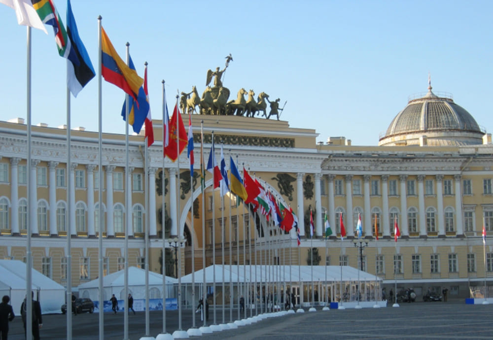 - Три: центральное место занимает государственный, а по бокам — флаги субъектов, организаций или стран-партнеров.