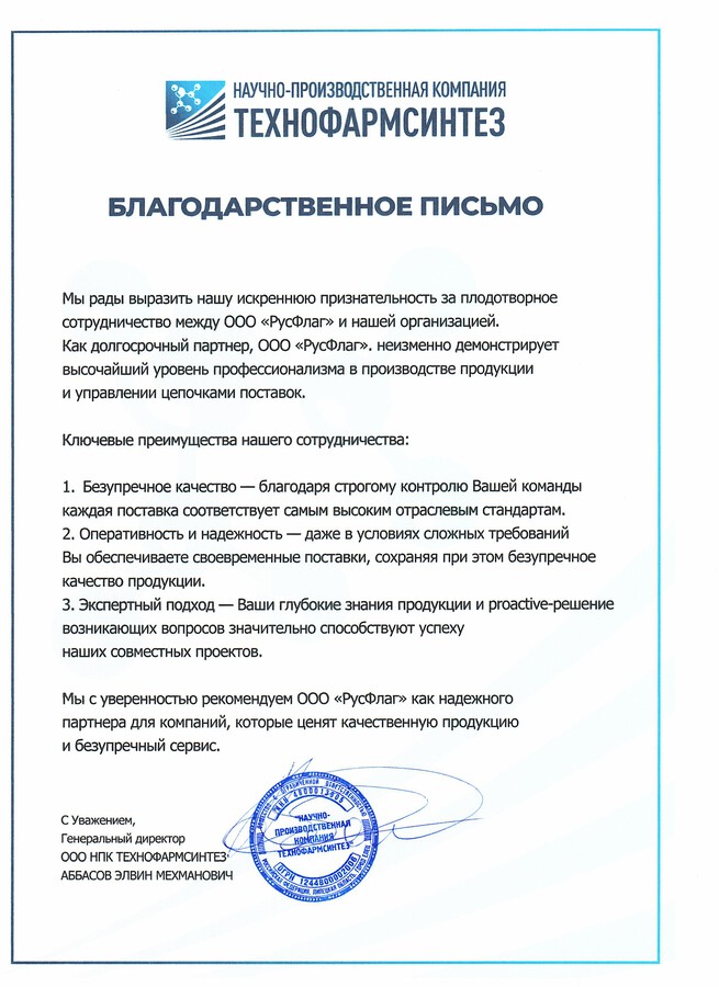 Мы рады выразить нашу искреннюю признательность за плодотворное сотрудничество между ООО «РусФлаг» и нашей организацией.